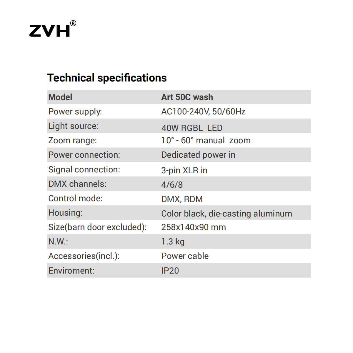 Art 50 T Wash — это проектор с линзой Френеля RGBL LED и зумом 10°–60°, подходящий для проецирования с разных расстояний. Литой корпус, конструкция без вентилятора. Цветовая температура регулируется в диапазоне 2700–6000 К. Идеальный выбор для художественных галерей, музеев и торговых центров.