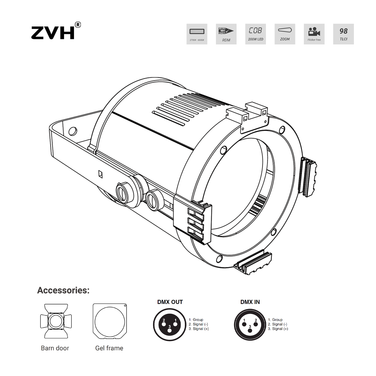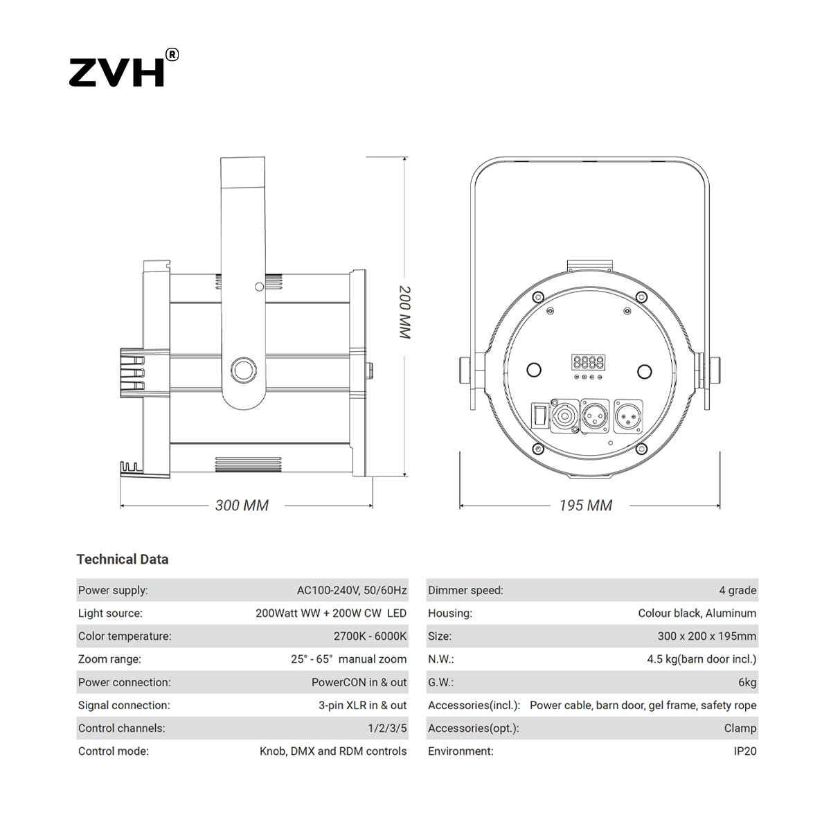 Event 200T — светодиодный френелевский прожектор мощностью 200 Вт (WW + 200 Вт CW) с функцией зума. Совместимость с RDM-DMX , ручной зум в диапазоне от 25 до 65 градусов и превосходный индекс цветопередачи (CRI) 95 делают этот прожектор отличной заменой традиционным френелевским прожекторам. Прожектор разработан для выставок.