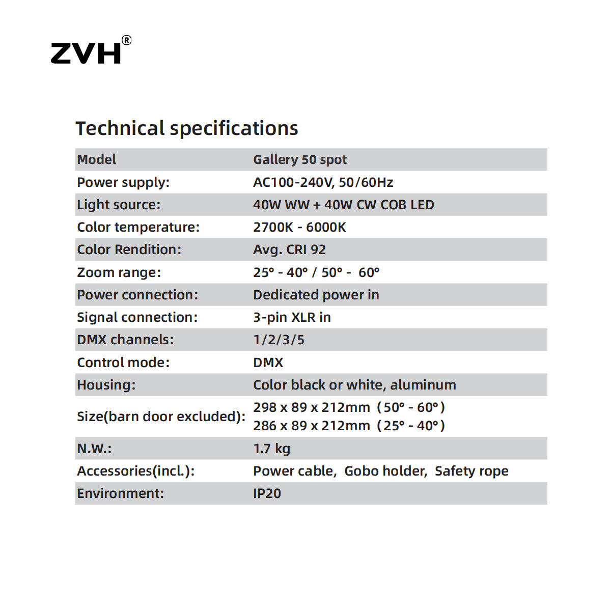 Gallery 50 Spot — это светодиодный профильный светильник мощностью 40 Вт с регулируемым COB-светодиодом. Корпус из алюминия, зум-объектив 25° - 40° / 50° - 60°, цветовая температура регулируется в диапазоне 2700K - 6000K. Идеальный выбор для художественных галерей, музеев и торговых центров.