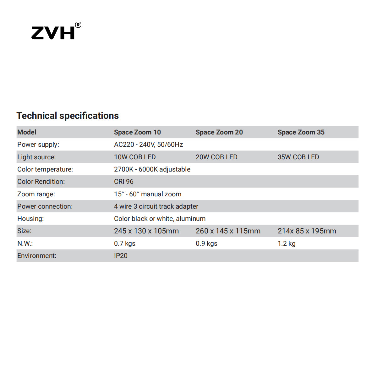 Space Zoom 20 — мощный прожектор заливающего света с регулируемым углом луча. Цветовая температура регулируется в диапазоне от 2700 до 6000 К. Высокий индекс цветопередачи (CRI), индекс TLCI и индекс TM30. Фиксированный тура, специально разработанная для музеев, магазинов класса люкс.